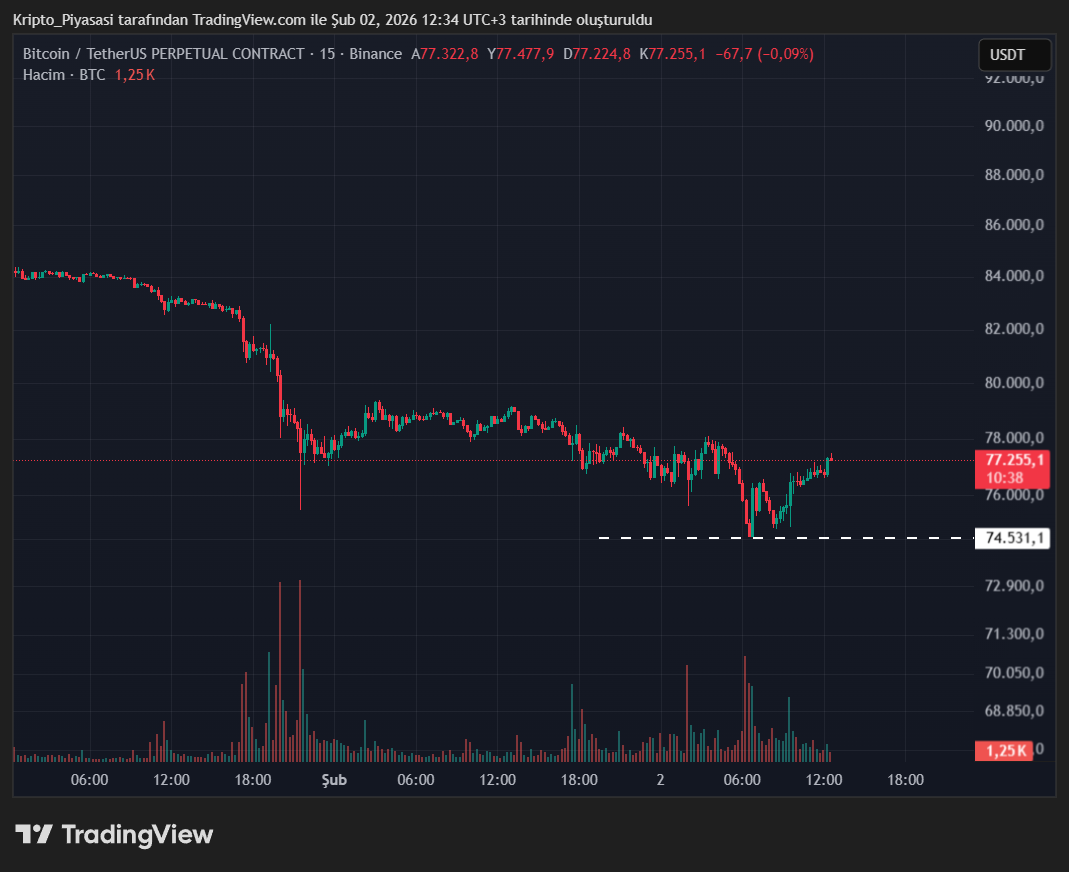 Sürecin ilerlemesiyle birlikte Bitcoin’in tekrardan toparlandığı ve 77 bin dolar seviyelerine yükseldiği gözlemlendi. Altın ve gümüşün çöküşünden etkilenen BTC, ayrışıp bir miktar yükseliş yaşadı.