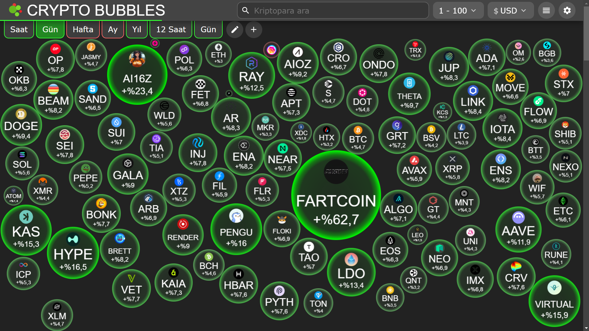 Her ne kadar FARTCOIN gibi dev çıkışlar yaşayan altcoin’lerde bulunsa da, ilk 100 içerisinde bugün %15’den daha fazla yükseliş yaşayan çok fazla kripto varlık bulunmamakta.