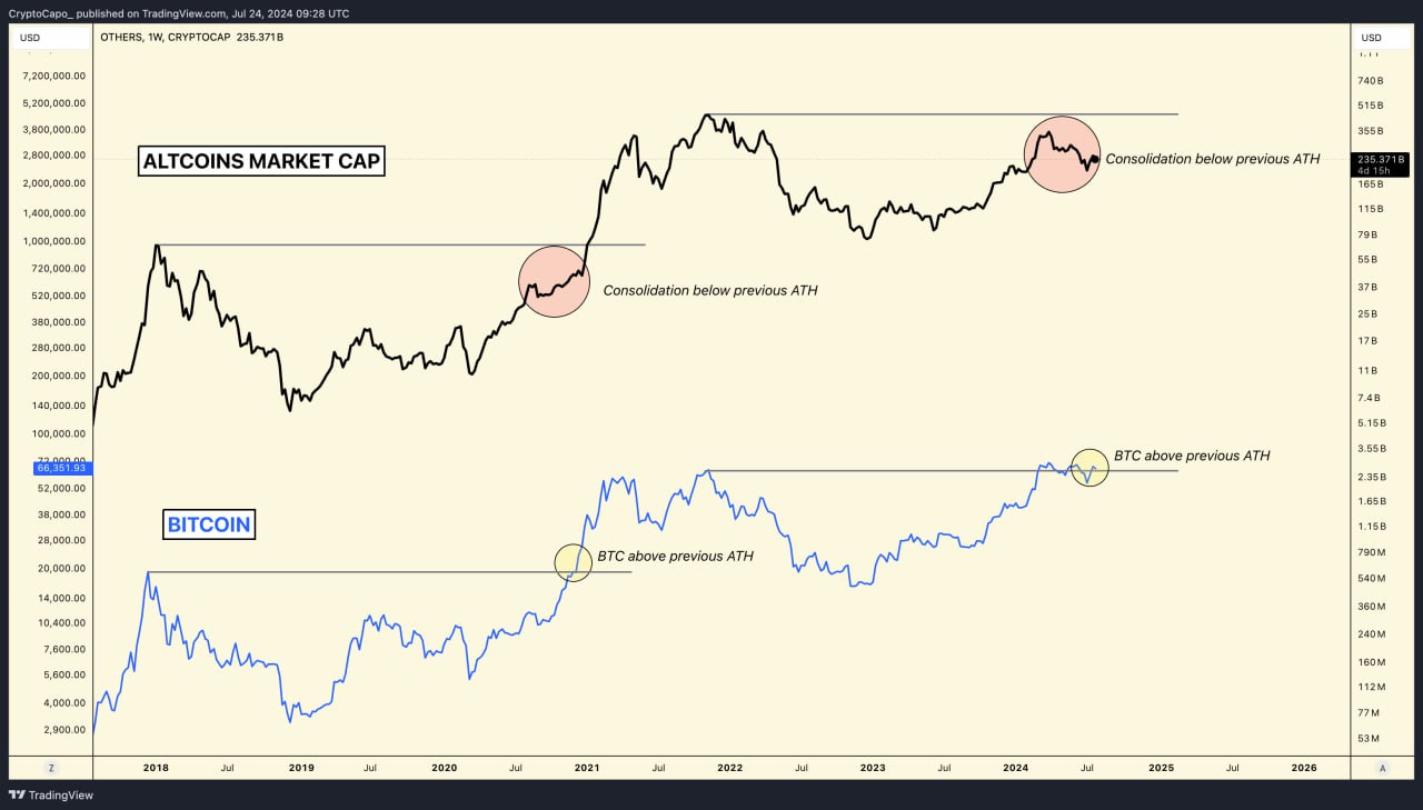 Yine geçmiş ile birçok benzerliğin bulunduğunun altını çizen Crypto Capo, önümüzdeki süreçte altcoin’lerin bir bir dev sıçramalar yaşayacağını düşünüyor.