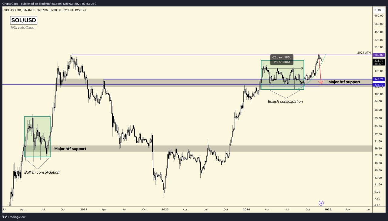 Solana (SOL) altı aylık bir konsolidasyon sürecinin ardından önemli ölçüde yükseldi ve yakın zamanda 2021’deki ATH’ye (Tüm Zamanların En Yüksek Seviyesi) ulaştı.