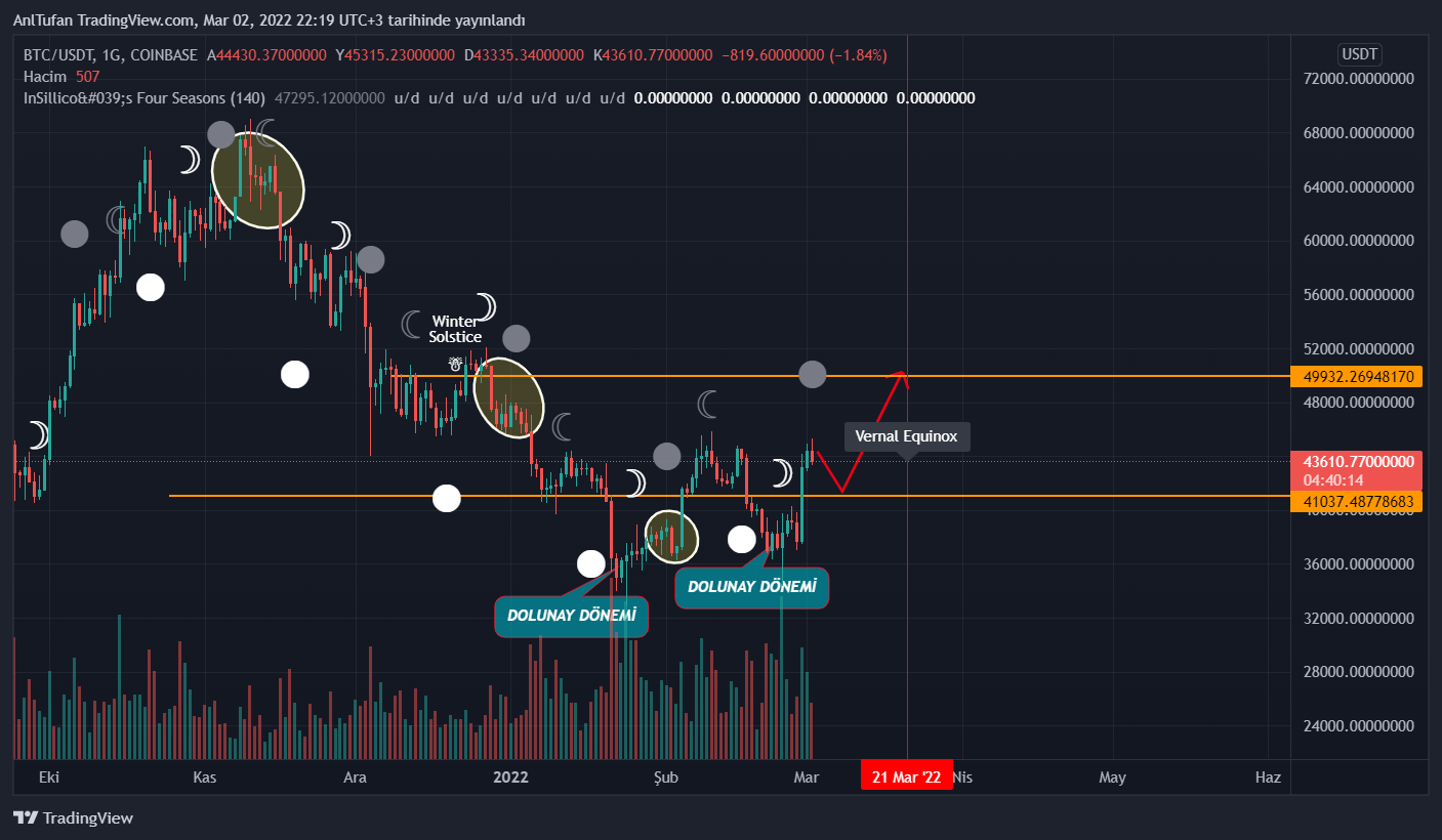 Grafik üzerinde belirttiğimiz 21 Mart tarihi ise İlkbahar Ekinoksunun başladığı tarih olarak göze çarpıyor. Geçtiğimiz dönemler İlkbahar Ekinoksunun ortaya çıkması Bitcoin’de çoğu zaman bir boğa sinyali olarak göze çarpmakta.