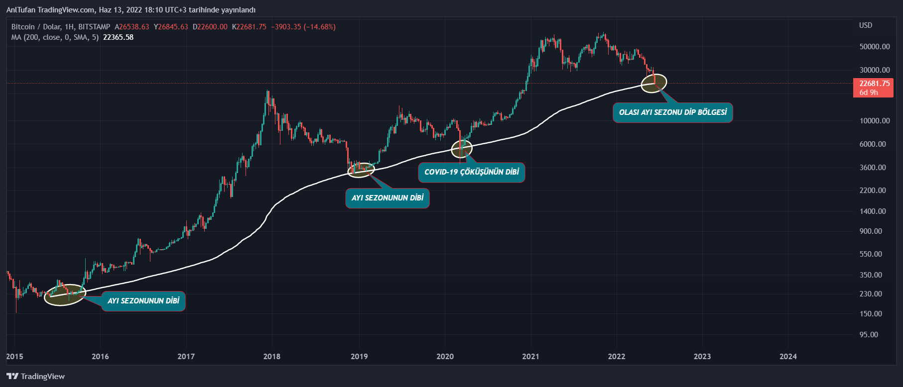 Birçok ayı sezonunda ve çöküşlerde 200 haftalık hareketli ortalamadan yükselişe başlayan lider kripto para birimi, bugün itibariyle yaşadığı düşüşlerle artık ayı sezonunun dibine ulaşmış olabilir.