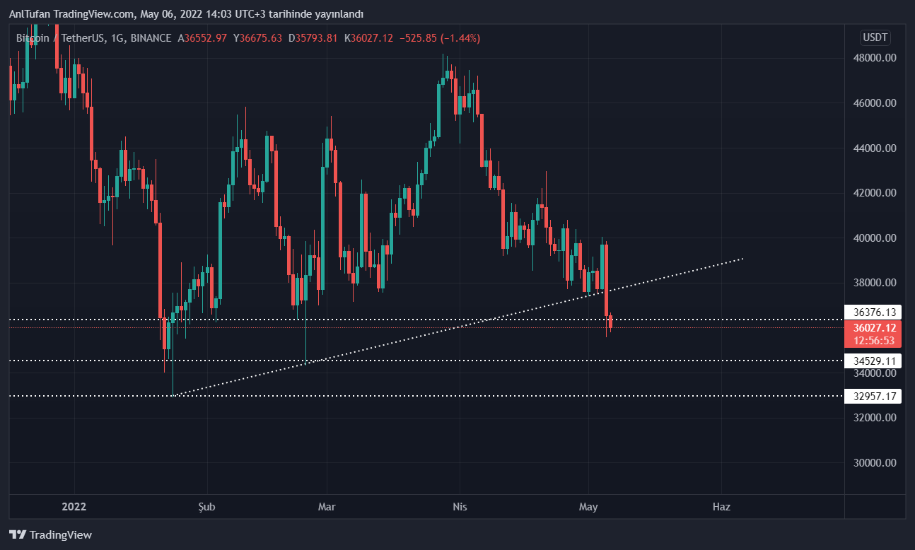 36.000 dolar seviyelerinde konumlanan lider kripto para, major yükselen trend olarak adlandırılan çizginin altında kapanış yapması piyasayı büyük bir tedirginliğe sürükledi.