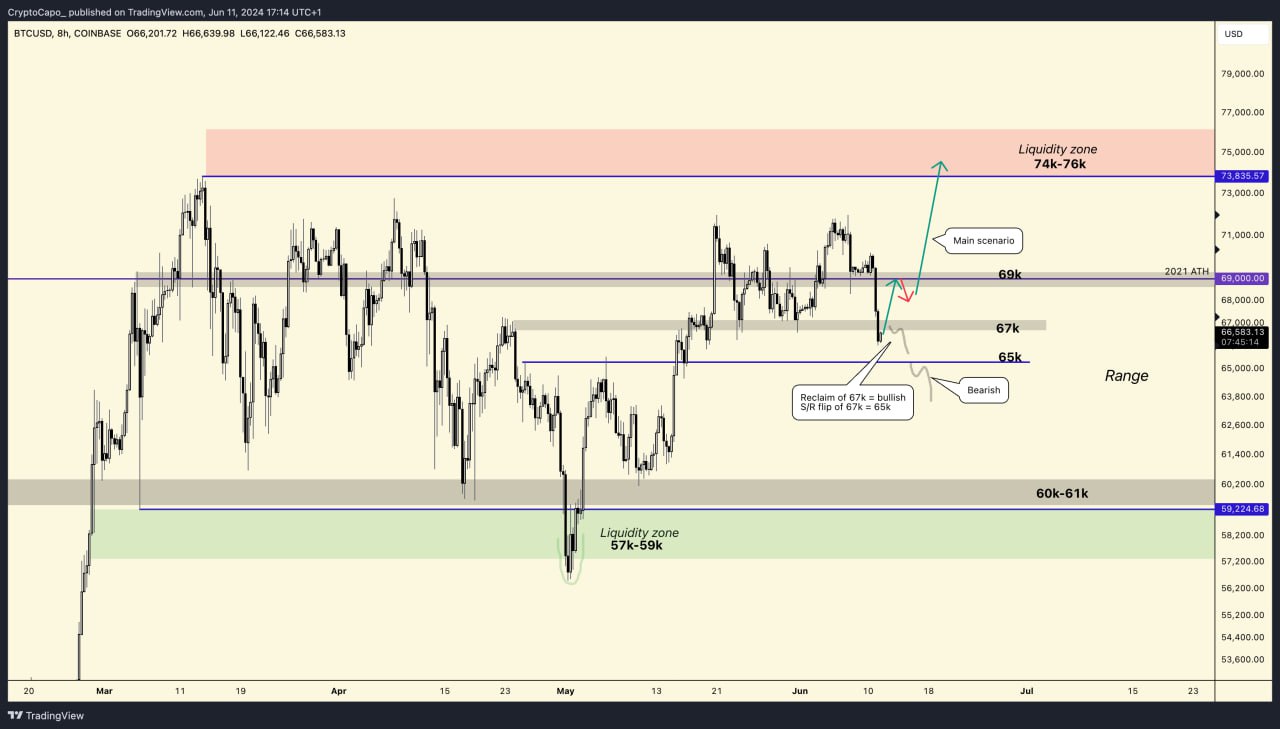 Önümüzdeki süreçte Crypto Capo lider kripto para birimi Bitcoin’in (BTC) 67 bin dolar desteğinin üzerinde kalacağını ve kademeli bir şekilde 75 bin dolar seviyelerine kadar yükseleceğine inanıyor.