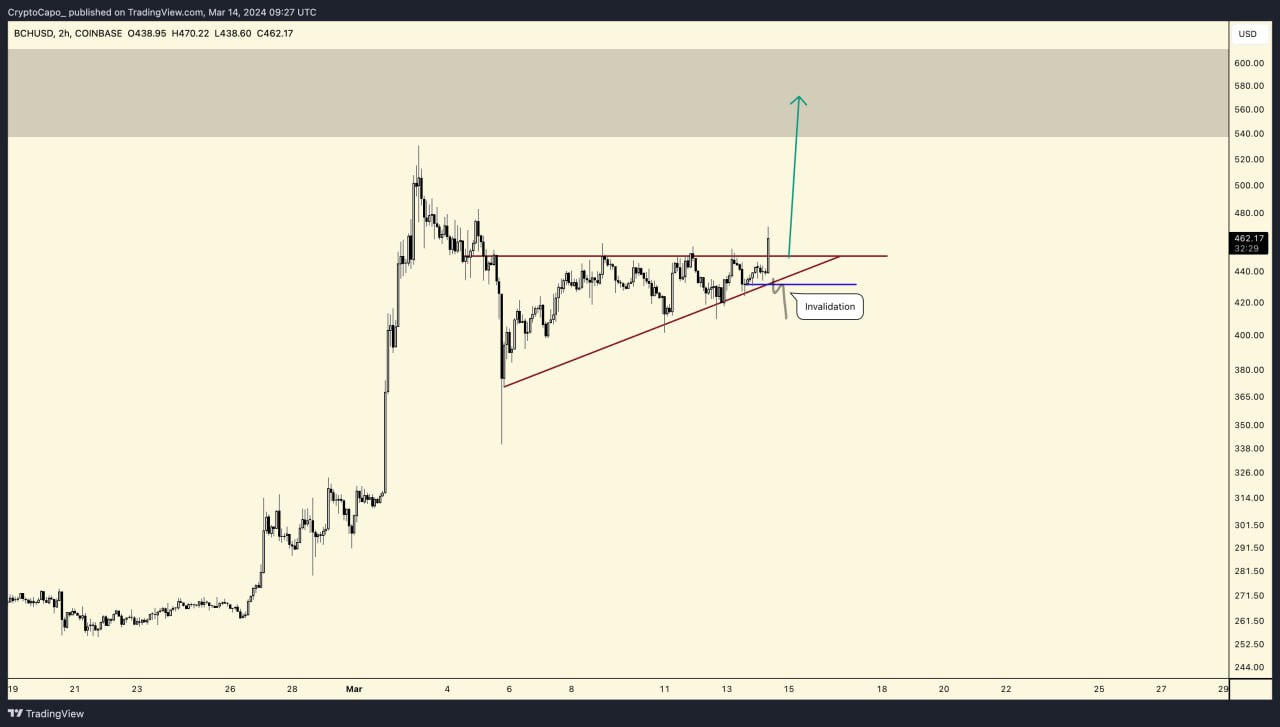 Bitcoin Cash (BCH) isimli altcoin’de ise daha kısa vadeli bir grafik paylaşan Capo, önümüzdeki dönemde BCH’ın 550 – 600 dolar bölgesine ulaşacağını düşünüyor.