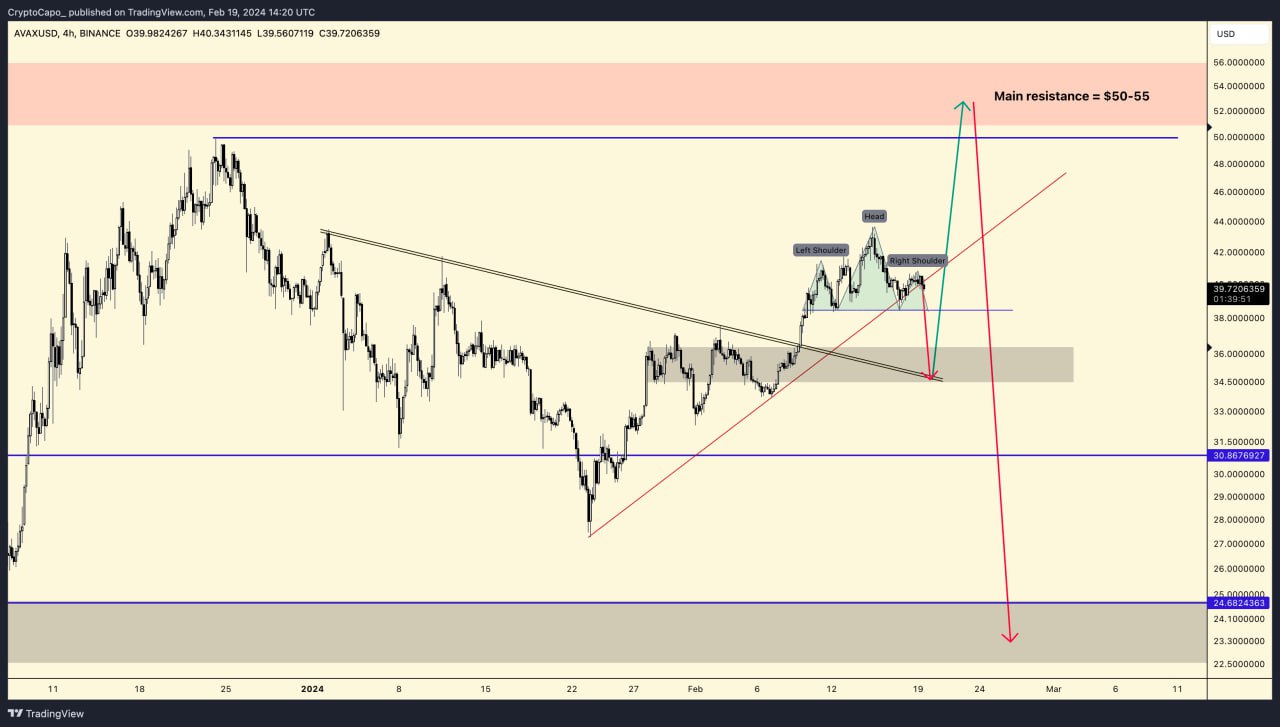 Kısa bir süre içerisinde AVAX’ın 50 – 55 dolar bölgesine yükseleceğini düşünen Crypto Capo, bu %40’lık yükseliş sonrasında durumların kötüleşeceğine inanıyor.