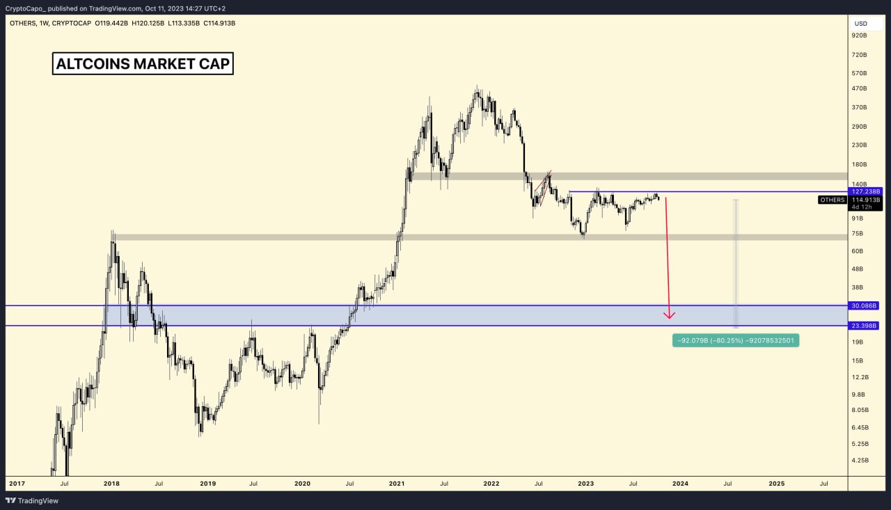 Crypto Capo önümüzdeki süreçte altcoin’lerin %80 oranında düşüş yaşayacağını düşünüyor. Birçok ürünün zirvesinden %90’luk düşüş yaşadığı bu ortamda dahi bu denli büyük bir çöküş beklemesi yatırımcıları korkutuyor.