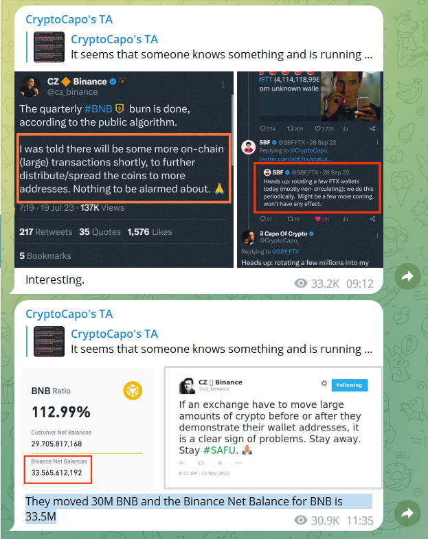Binance CEO’su CZ’nin son paylaşımlarını FTX kurucusu SBF’nin paylaşımlarına benzeten Capo, BNB ve yukarıdaki listede yer alan altcoin’lerde sert düşüşler beklemekte.
