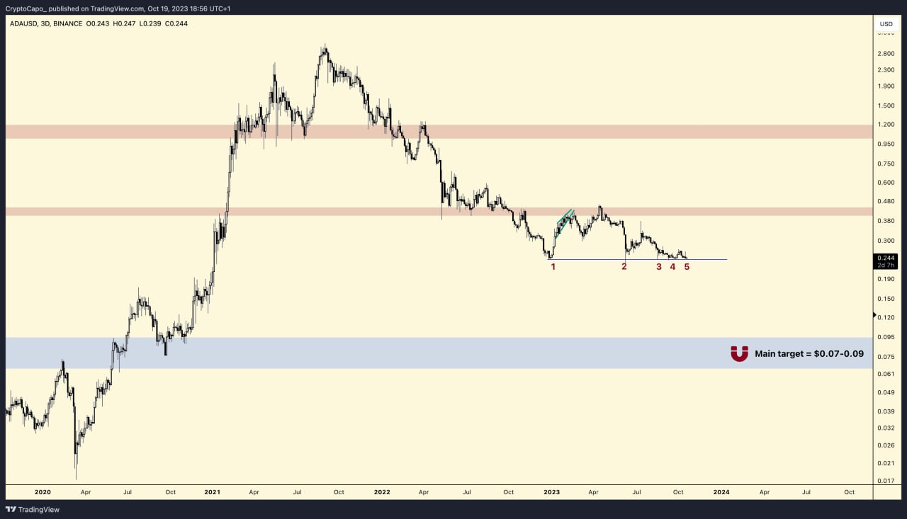Crypto Capo ise zirve seviyesinden %90’dan fazla düşmüş olan ADA’nın, yüzde 70’lik bir çöküş daha yaşayarak 0.07 – 0.09 dolar aralığına gerileyeceğini düşünüyor.