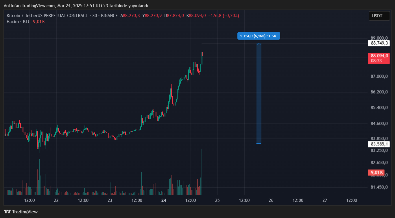 Bitcoin cumartesi gecesi 83.500 dolar seviyelerinden işlem görüyordu. Çok kısa bir süre içerisinde toparlanan ve 88.750 dolara yükselen BTC, tüm kripto yatırımcılarının dikkatini çekti.