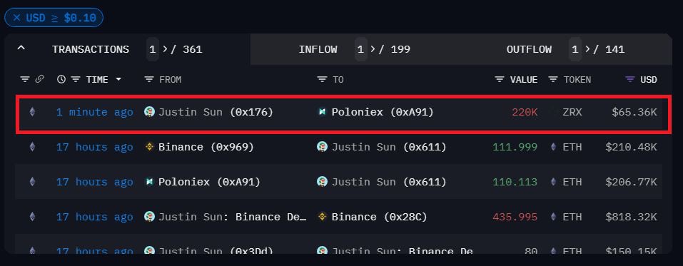 “Saat 13:22’de Justin Sun cüzdanından Poloniex borsasına 220 bin adet ZRX gönderildi. (65.360 dolar değerinde)”