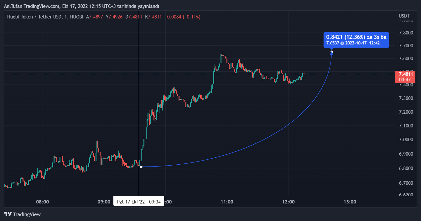 Justin Sun’ın bu tweet’inin 09.35’de paylaştığı görülüyor. Tweet’in gelmesinin ardından sonra ise dakikalar içerisinde yüzde 12 oranında yükselen HT, tekrardan balinaların odak noktası haline geldi.