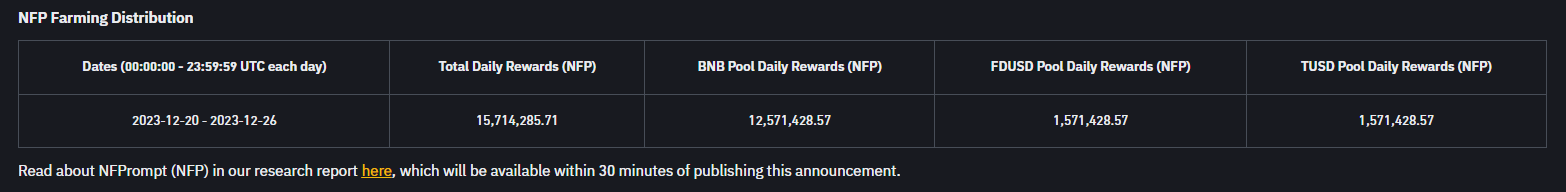 Kullanıcılar, 2023/12/21 03:00 (TSİ) tarihinden başlayarak yedi gün boyunca NFP tokenlerini toplamak için BNB, FDUSD ve TUSD’lerini ayrı havuzlarda stake edebilecekler.