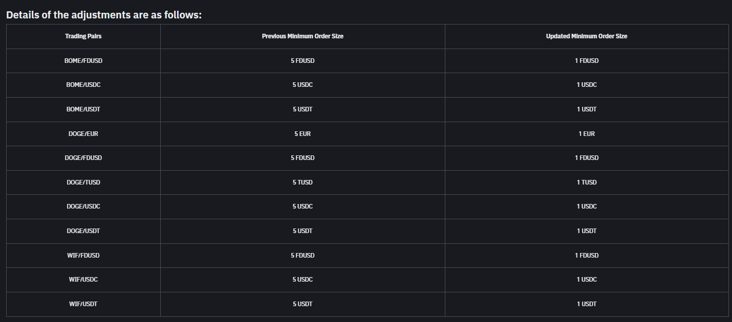 Binance ilk duyuruda BOME, DOGE ve WIF‘in tüm paritelerinin minimum sipariş miktarını 5 dolardan 1 dolar seviyelerine çekti. Bu hamle daha düşük miktarlarda da memecoin alınabilmesini sağlatacak. İşte Binance’in paylaştığı duyuruda yer alan altcoin pariteleri: