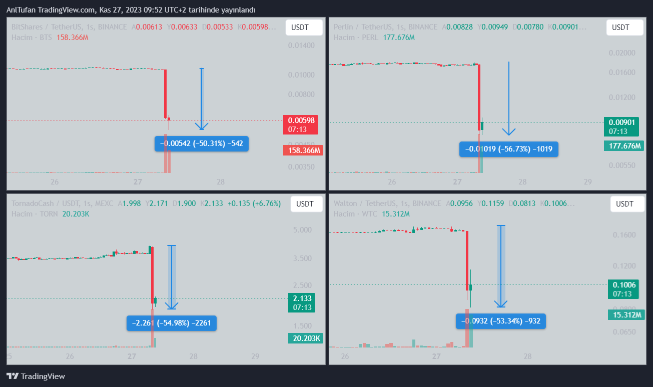 Bugün Binance’in delist kararı sonrası BTS, TORN, PERL ve WTC’nin ilk fiyat hareketini merak eden okurlarımız, aşağıdaki görseli inceleyebilir: