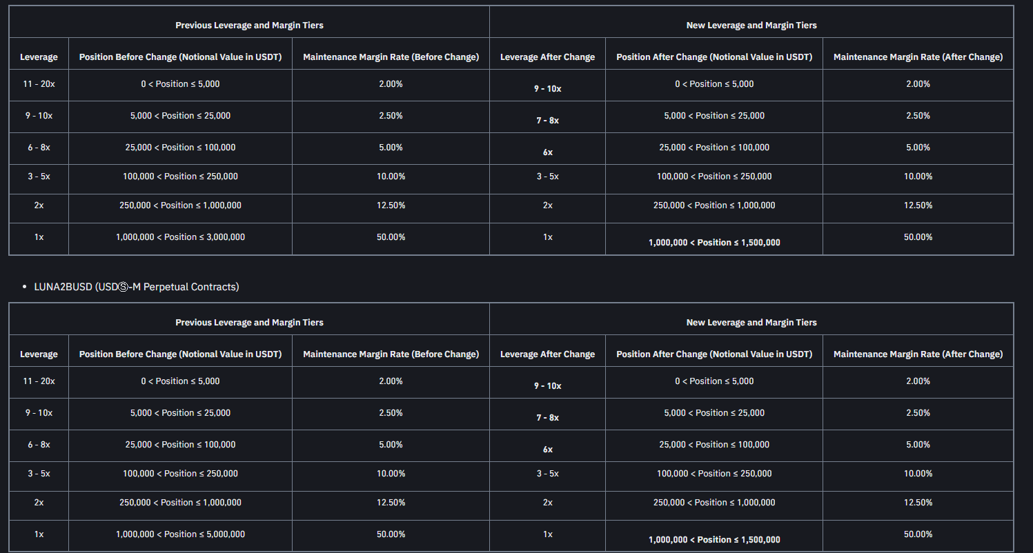 “Ayrıca Binance Futures, aşağıdaki tablolara göre 2023-03-20 13:00 (tsi) itibarıyla USDⓈ-M ICPBUSD ve LUNA2BUSD Sürekli Sözleşmelerinin kaldıraç ve marj katmanlarını ayarlayacaktır.”