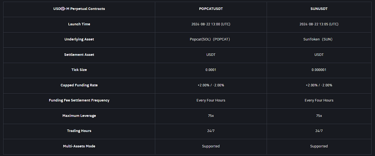 Son paylaştığı duyuruda POPCAT ve SUN isimli 2 memecoin‘i de vadelide listeleyeceğini açıklayan Binance, bu 2 ürünün yukarı yönlü hareketler sergilemesini sağladı.