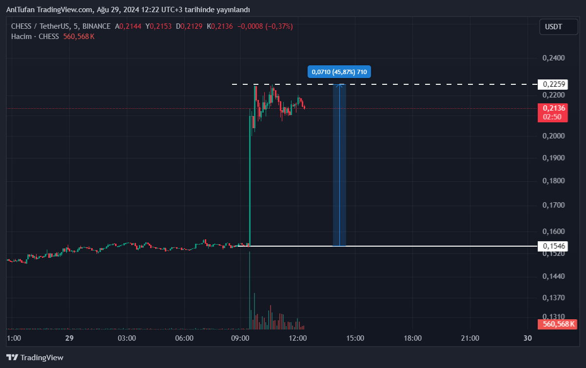 Başarılı borsa bugün itibariyle CHESS isimli altcoin‘i vadeli piyasada listelemeye karar verdi. Bu gelişme sonrasında CHESS fiyatında %50’ye yakın ani yükselişler yaşandı.