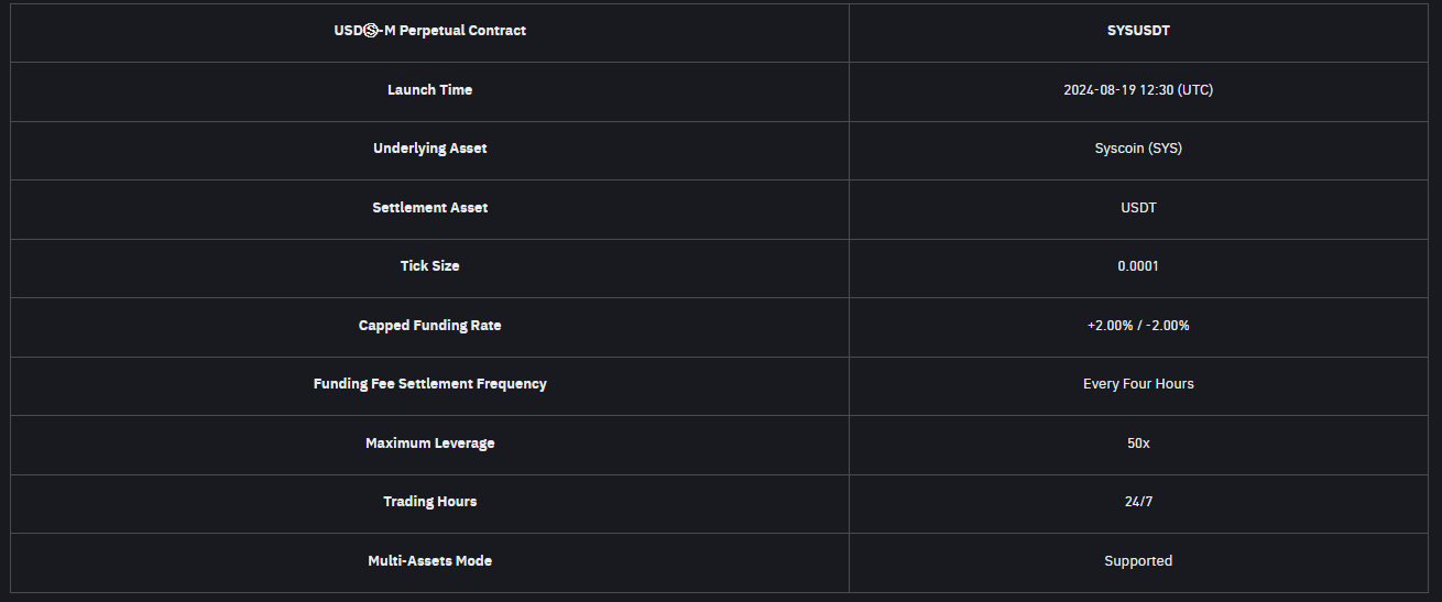 Popüler kripto para borsası Binance, SYS vadeli listeleme duyurusunda başlıca şu bilgileri aktardı: