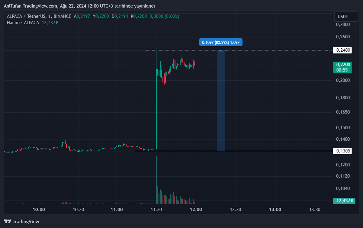 Bu gelişme sonrasında ALPACA fiyatında dev sıçramanın meydana geldiği görüldü. Dakikalar içerisinde %83 oranında değer kazanmayı başaran ALPACA, yatırımcıların dikkatini üzerine çekti.