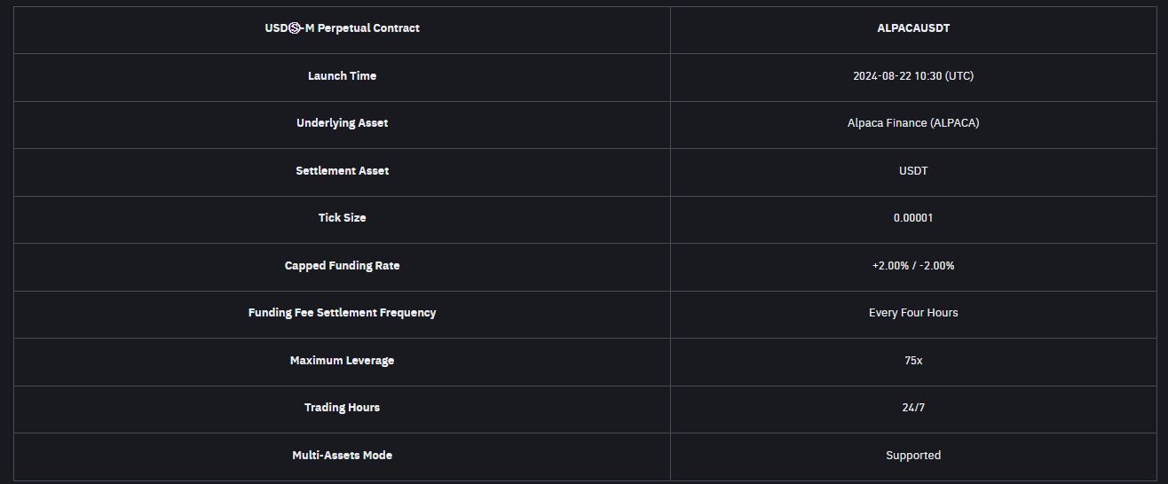 Popüler kripto para borsası Binance, ALPACA vadeli listeleme duyurusunda başlıca şu bilgileri aktardı: