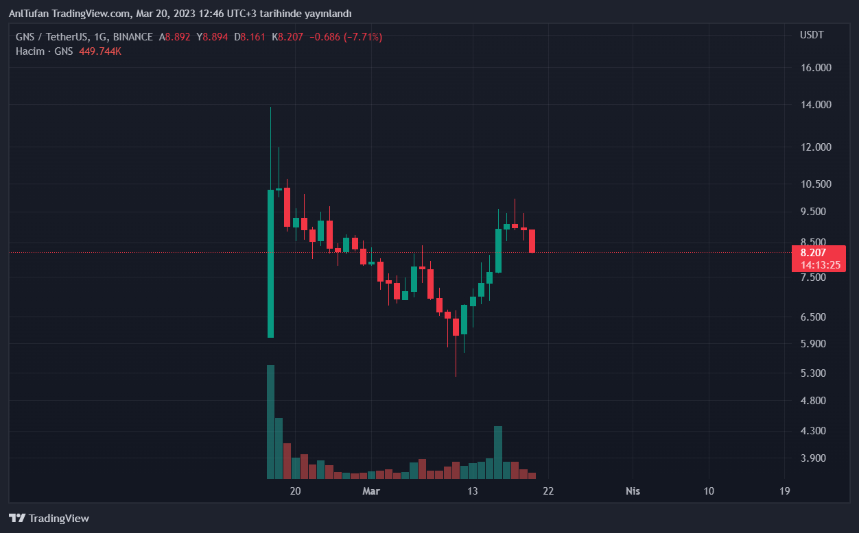 Binance borsasının bu olumlu duyurusuna rağmen GNS’nin son 24 saat içerisinde yüzde 8 oranında değer kaybettiği görülüyor. Popüler altcoin son dönemlerdeki yükselişlerinin ardından bir düzeltme trendine girmiş olabilir.