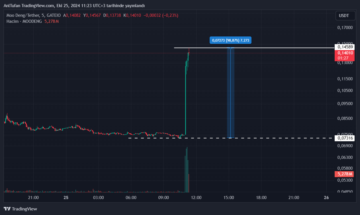 Bu son gelen listeleme duyurusu ile birlikte MOODENG fiyatında çok sert bir sıçrama yaşandı. Dakikalar içerisinde %100’lük bir artış yaşayarak değerini 2’ye katlayan popüler altcoin, yatırımcıların dikkatini çekti.