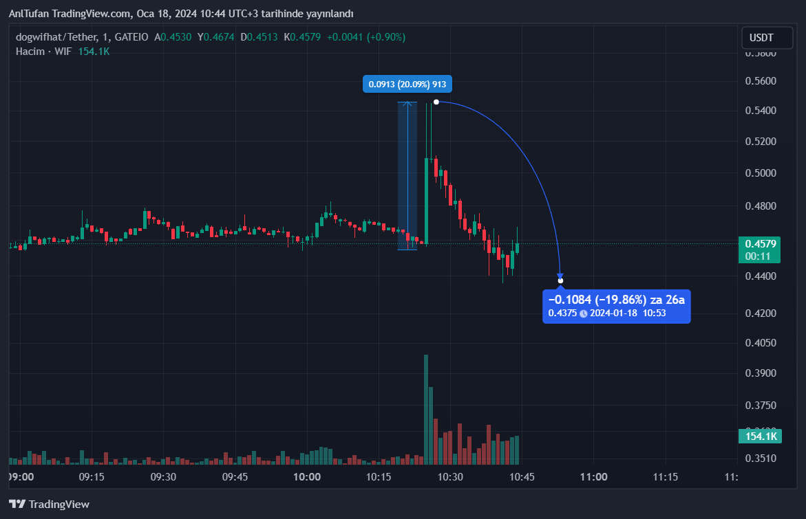 Bir süredir yaşadığı sert yükselişler ile sektörün gündemine gelen WIF, Binance’in vadeli listeleme hamlesi sonrasında ilk etapta %20’lik bir yükseliş yaşasa da, ilerleyen dakikalarda yükselişlerinin tamamını kaybetti.