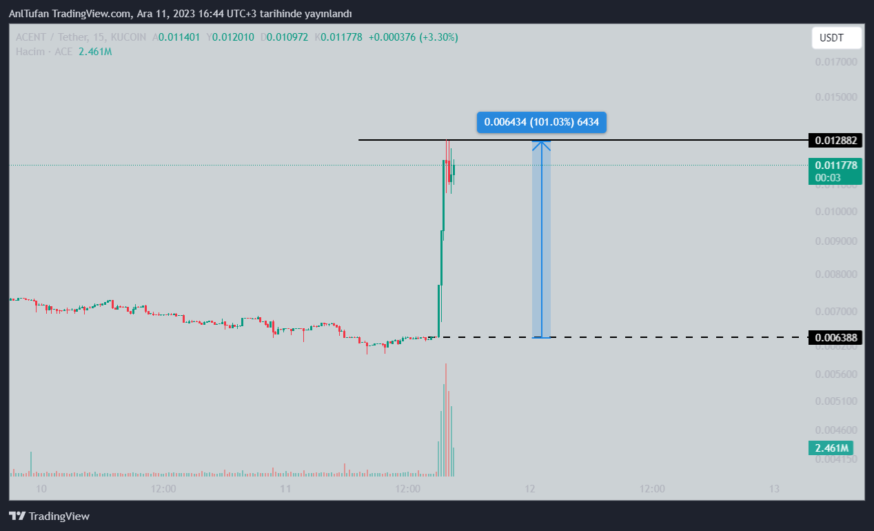 18 Aralık tarihinde Binance’de de listelenecek olan ACE, son gelen haber ile birlikte %100’lük bir artış yaşadı ve değerini 2’ye katlamayı başardı.
