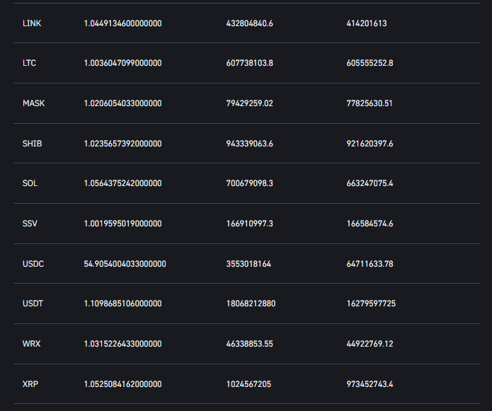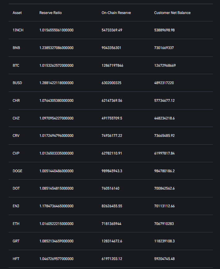 Okurlarımız aşağıda yer alan listede popüler borsa Binance’in rezerv kanıtı sisteminde yer alan tüm altcoin’leri ve net müşteri bakiyelerini detaylıca inceleyebilirler: