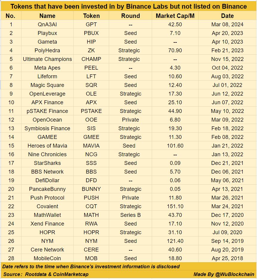 Binance’in daha önce yatırım yaptığı ancak listelemediği ürünleri tespit eden Wu Blockchain, Binance’in önümüzdeki süreçte aşağıda yer alan 28 altcoin’i listeleyebileceğini aktardı: