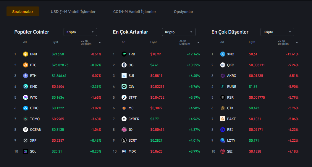 Hadi gelin bugün itibariyle Binance‘deki en çok artan ve düşen altcoin’lere birlikte göz atalım: