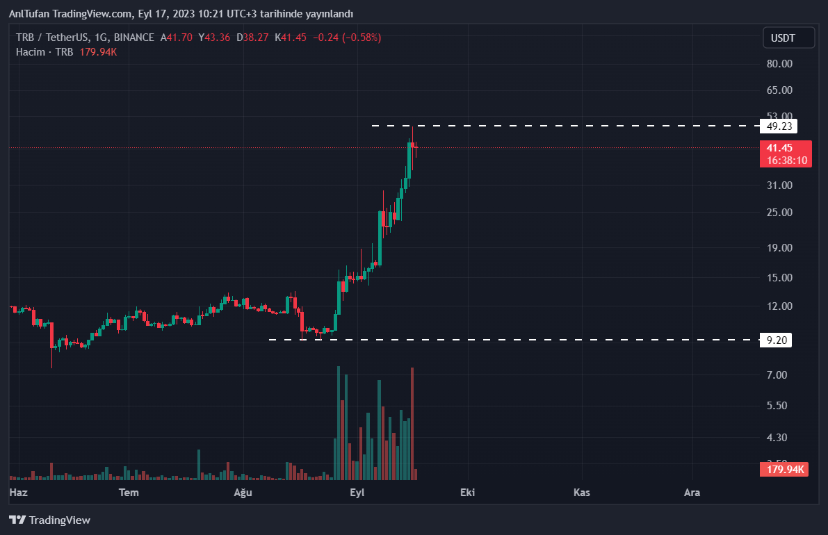 Ağustos ayının ortalarında 10 dolar seviyelerinden işlem gören TRB, an itibariyle 41 dolar seviyelerinde konumlanıyor. TRB’deki bu dev artış yine kripto balinaları sayesinde gerçekleşti.