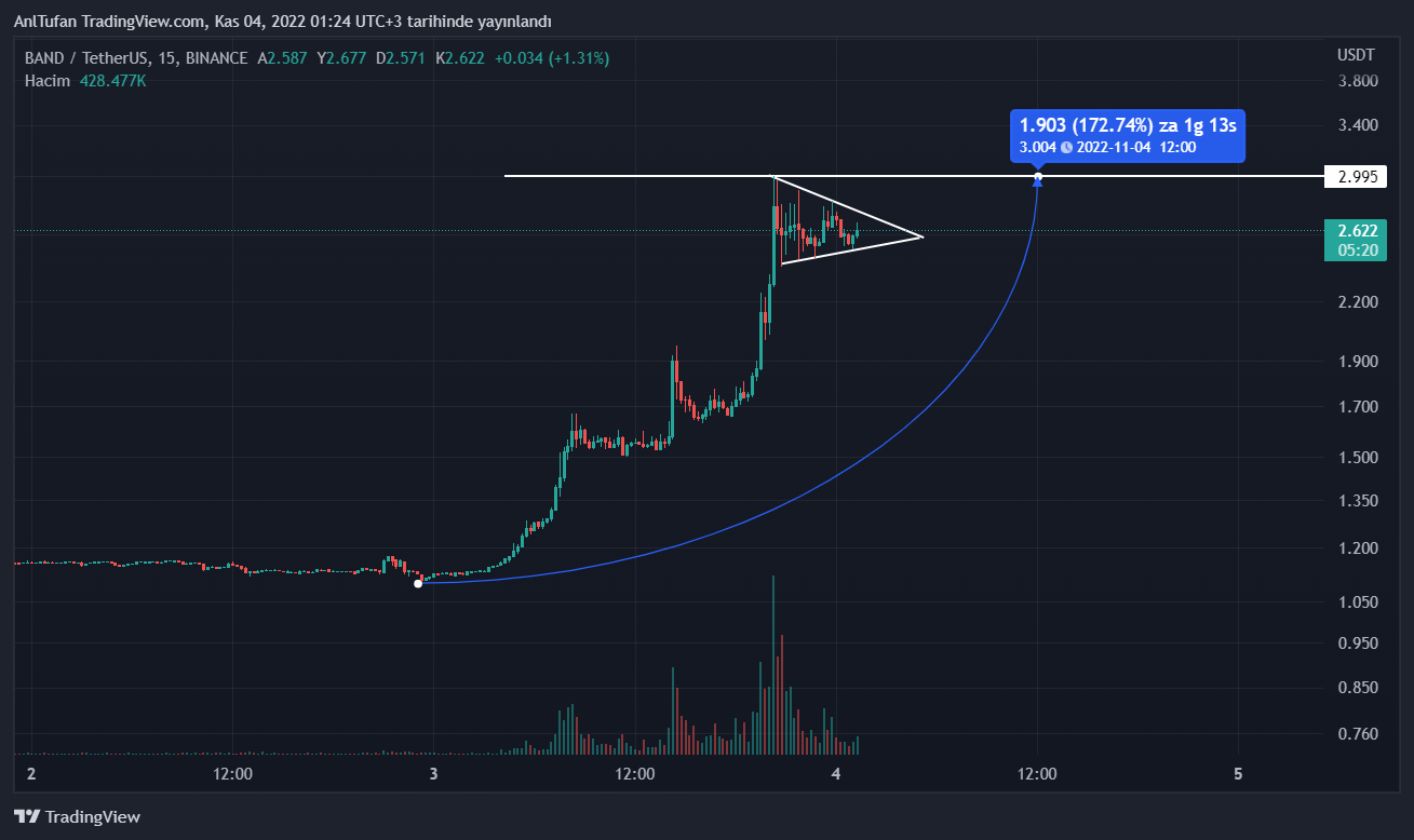 Band Protocol ise an itibariyle zirve seviyede bir boğa flaması oluşturmuş durumda. İlerleyen saatlerde boğaların tekrardan devreye girmesi, BAND’ın bu flamayı yukarı yönlü kırmasını sağlayabilir.