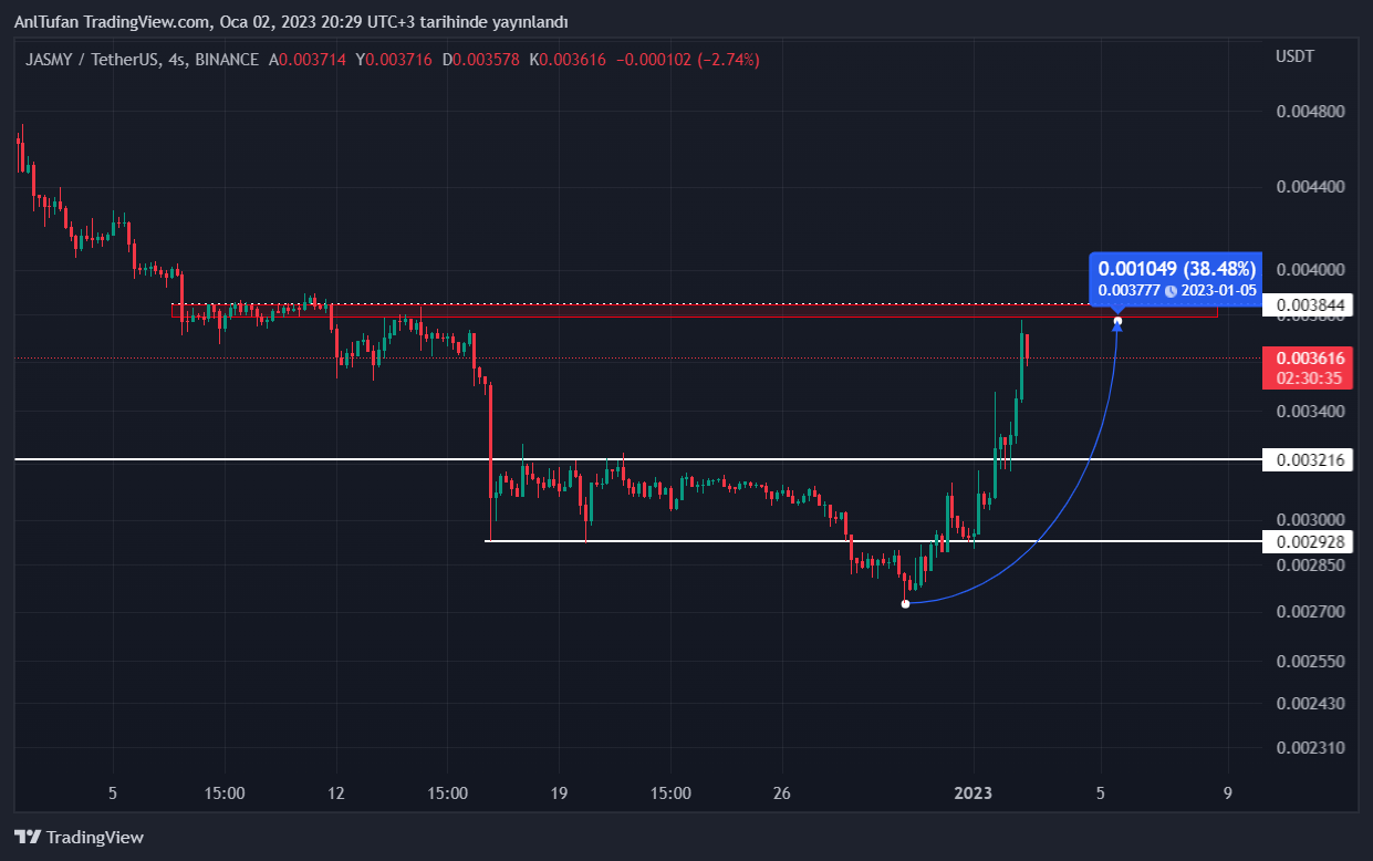 Şuan itibariyle 0.003844 dolar direncinin altında yer alan JASMY, bu direnci de aşması halinde, 0.0050 dolara kadar değer kazanabilir gibi gözüküyor.