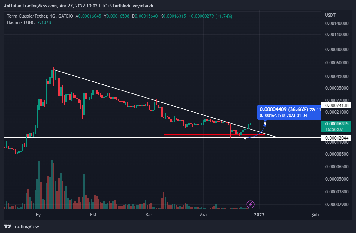 0.00012 dolar desteğinden aldığı tepki ile günlük grafik üzerindeki major düşen trendini kırmayı başaran LUNC, ilerleyen günlerde 0.00024 dolar direncine yükselmesi bekleniyor.