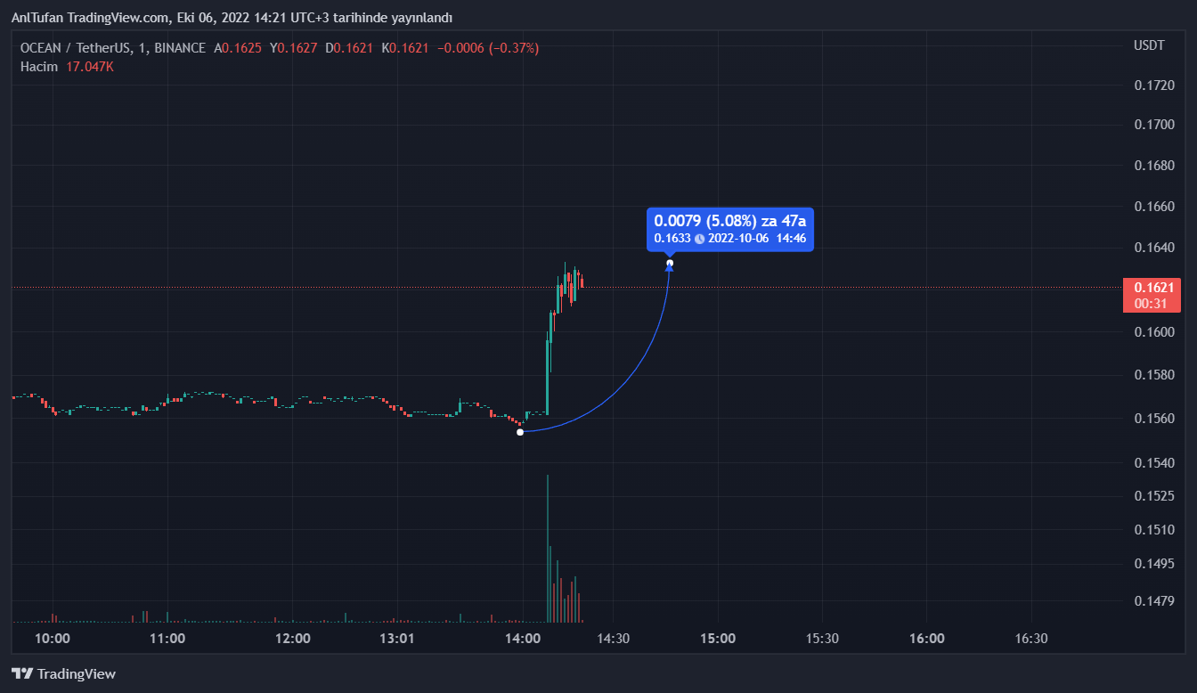 Ocean Protocol resmi Twitter hesabı üzerinden yapılan paylaşımın ardından OCEAN‘ın dakikalar içerisinde yüzde 5 oranında yükseliş yaşadığı görülüyor.