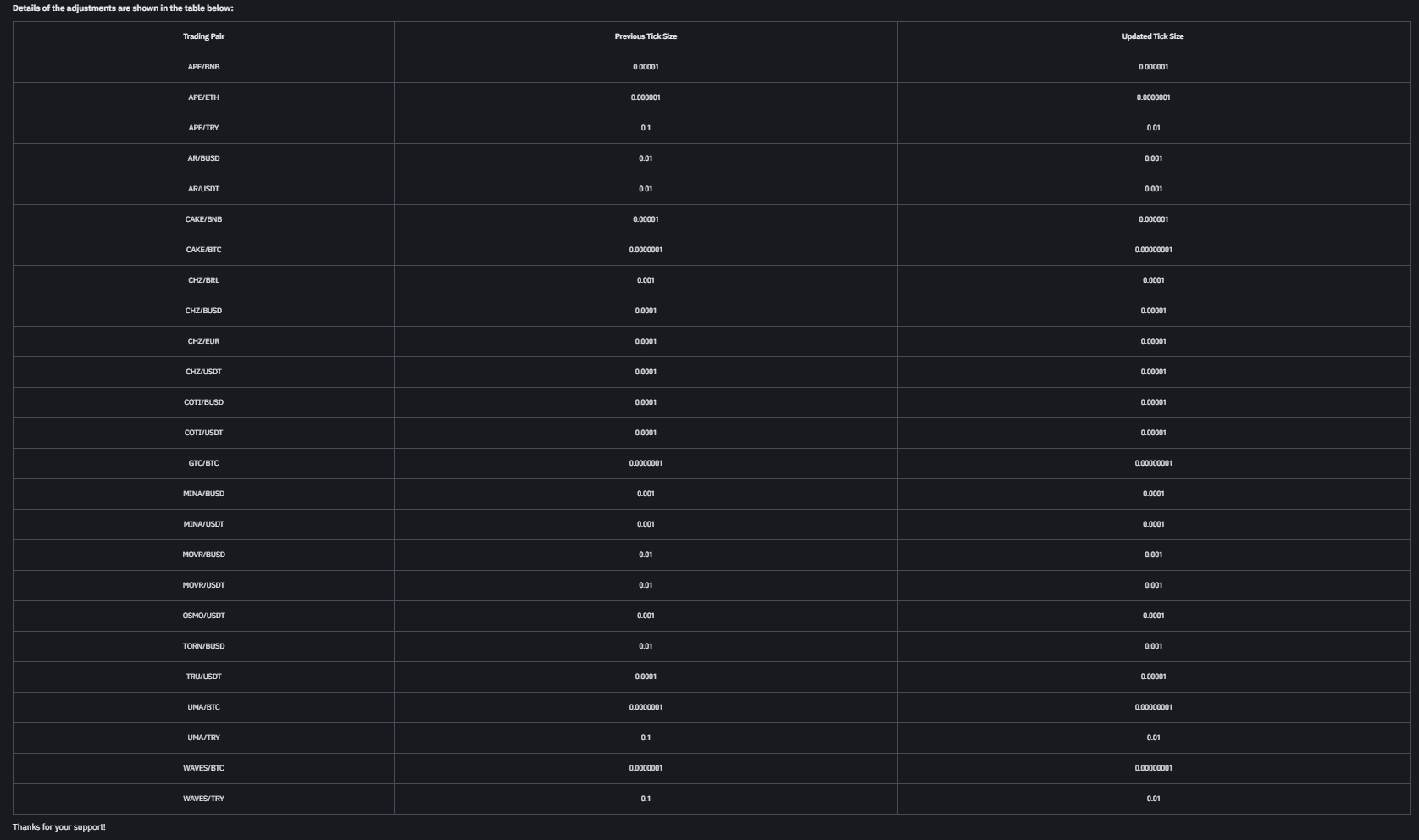 “Piyasa likiditesini artırmak ve alım satım deneyimini geliştirmek amacıyla Binance, belirli spot alım satım çiftlerinin onay büyüklüğü (yani birim fiyattaki minimum değişiklik) için ayarlamaları 10-10-2023 10:00 (TSİ) tarihine kadar tamamlayacak.