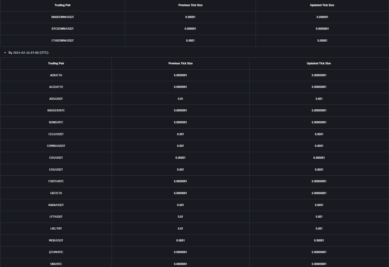 Binance paylaşılan bilgilere göre bazı işlem çiftlerindeki onay boyutunu değiştirecek. İşte Binance’in onay boyutu güncellemesi yapacağı kripto varlık paritelerinin tam listesi: