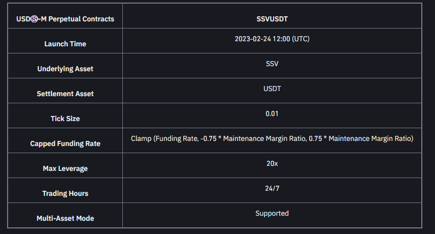 “Binance Futures, 20 kata kadar kaldıraçla 2023-02-24 15:00 (tsi) tarihinde USDⓈ-M SSV kalıcı sözleşmelerini başlatacak.”