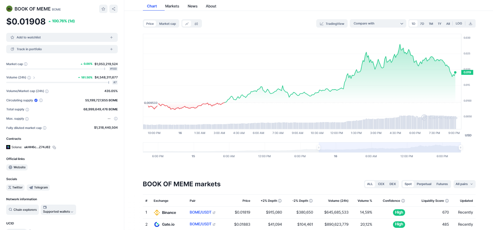 Book of Meme (BOME) son yaşadığı devasa yükselişler ile birlikte piyasa değerine göre ilk 100 kripto para biriminin içerisine girmiş durumda.