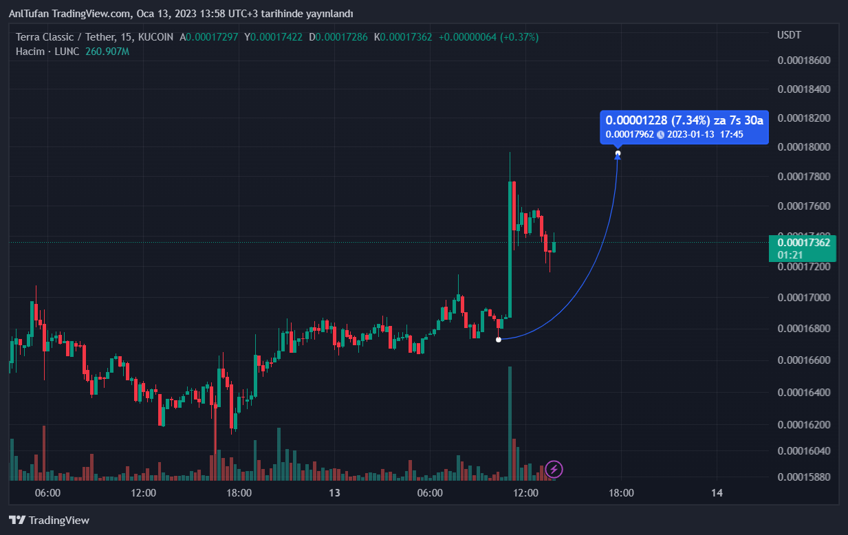 Türk kripto para yatırımcılarının da yoğun bir şekilde takip ettiği LUNC, Binance’in duyurusunun ardından yüzde 8’e yakın değer kazandı. Her ne kadar LUNC şuan itibariyle bir düzeltme yaşamış olsa da, ilerleyen saatlerde tekrardan hareketlenebilir.