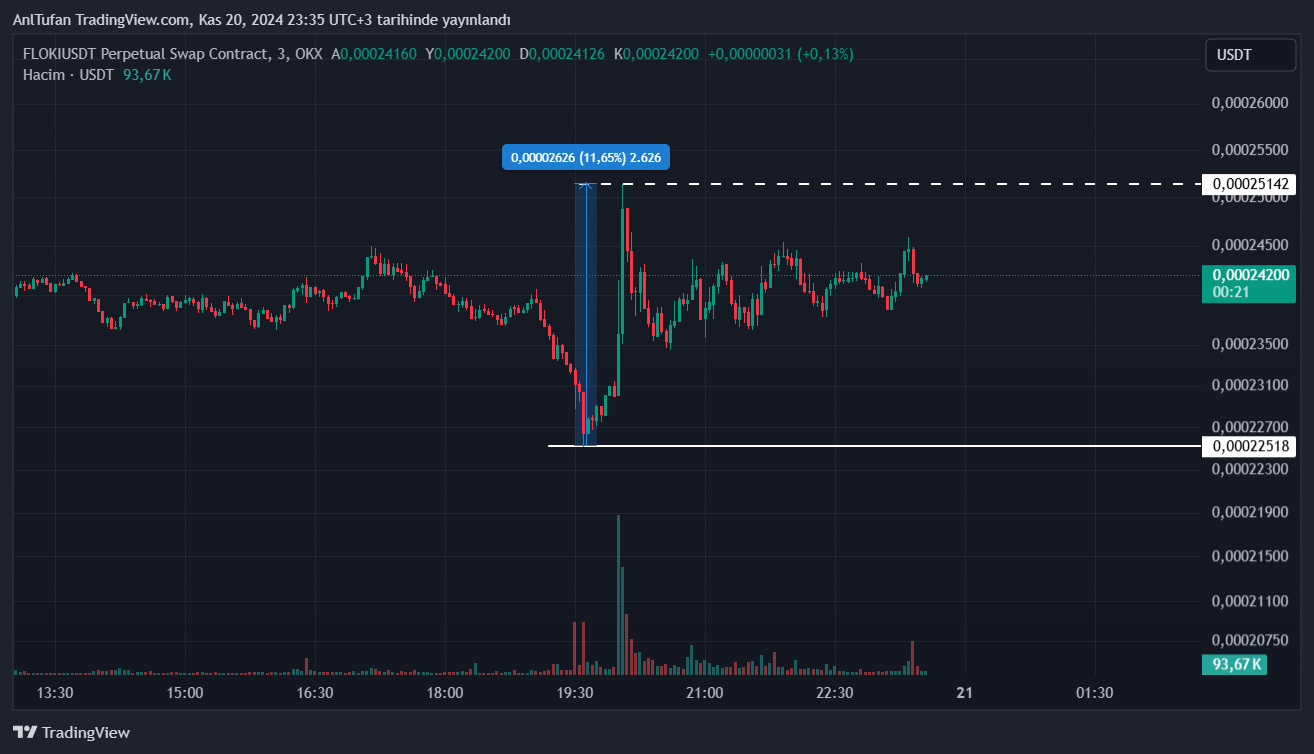 Bu paylaşılan listeleme duyurusu sonrasında FLOKI fiyatında yükselişlerin yaşandığı görüldü. Dakikalar içerisinde %10’dan fazla değer kazanan popüler memecoin, sürecin ilerlemesine rağmen bu yükselişlerin önemli bir kısmını korumayı başardı.