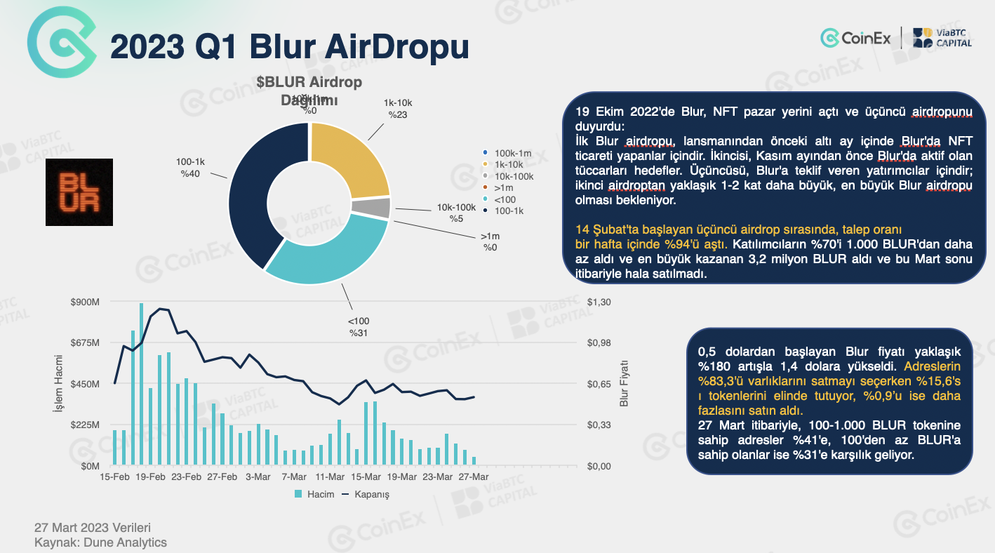 14 Şubat’ta başlayan üçüncü airdrop sırasında, talep oranı bir hafta içinde %94’ü aştı. Katılımcıların %70’i 1.000 BLUR’dan daha az aldı ve en büyük kazanan 3,2 milyon BLUR aldı ve bu Mart sonu itibariyle hala satılmadı.