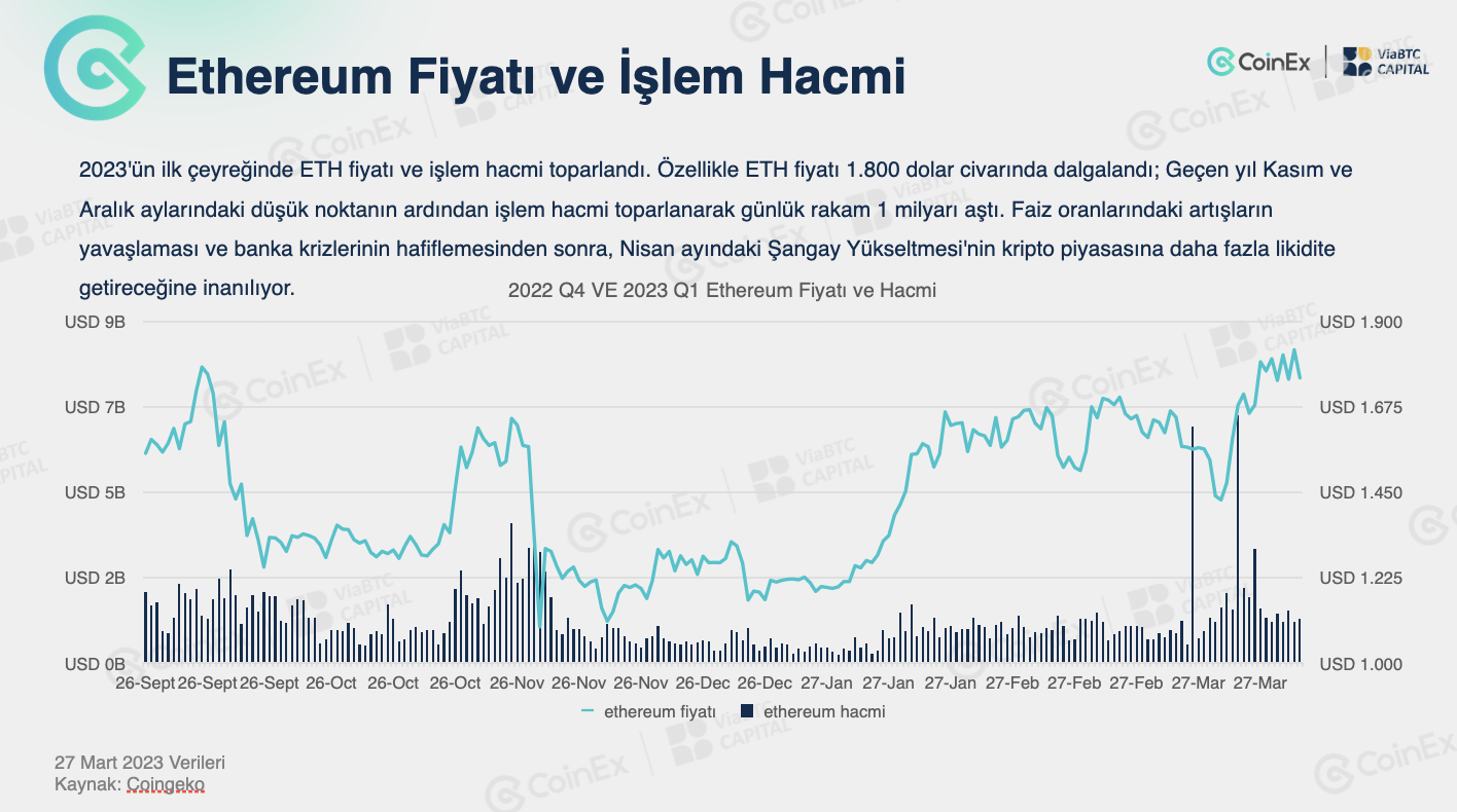 2023’ün ilk çeyreğinde ETH fiyatı ve işlem hacmi toparlandı. Özellikle ETH fiyatı 1.800 dolar civarında dalgalandı; Geçen yıl Kasım ve Aralık aylarındaki düşük noktanın ardından işlem hacmi toparlanarak günlük rakam 1 milyarı aştı.