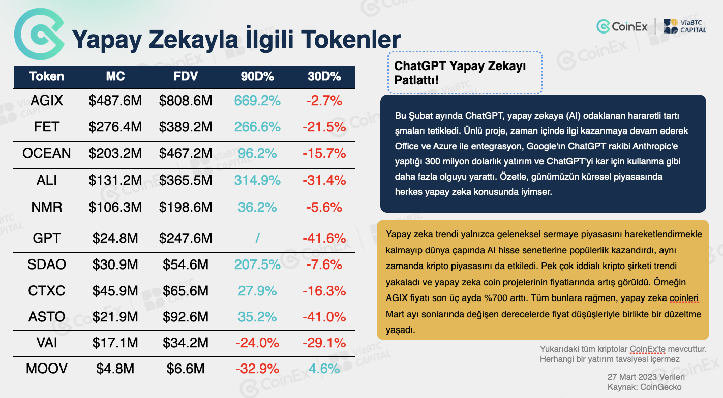 Yapay zeka trendi yalnızca geleneksel sermaye piyasasını hareketlendirmekle kalmayıp dünya çapında AI hisse senetlerine popülerlik kazandırdı, aynı zamanda kripto piyasasını da etkiledi. Pek çok iddialı kripto şirketi trendi yakaladı ve yapay zeka coin projelerinin fiyatlarında artış görüldü.