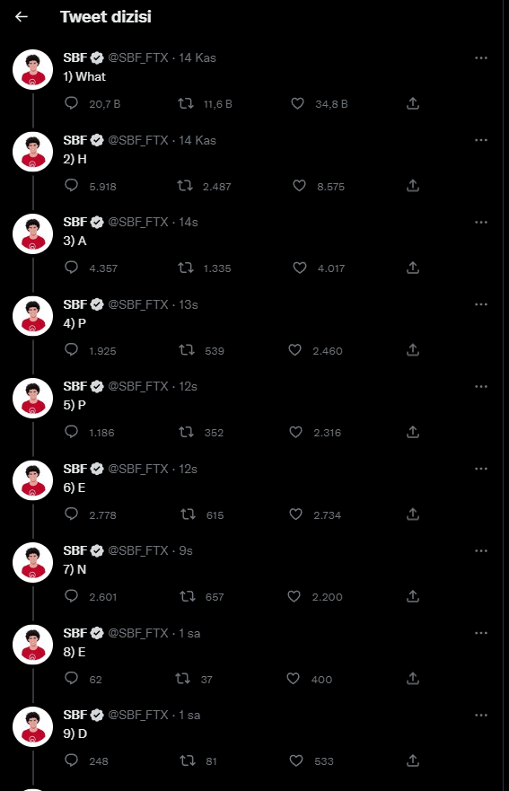 An itibariyle FTX kurucusu SBF’nin paylaşımları tamamlanmış durumda. “What Happened (Ne Oldu)?” şeklinde paylaşılan bu tweet dizisi birçok kripto para yatırımcısının dikkatini çekti.