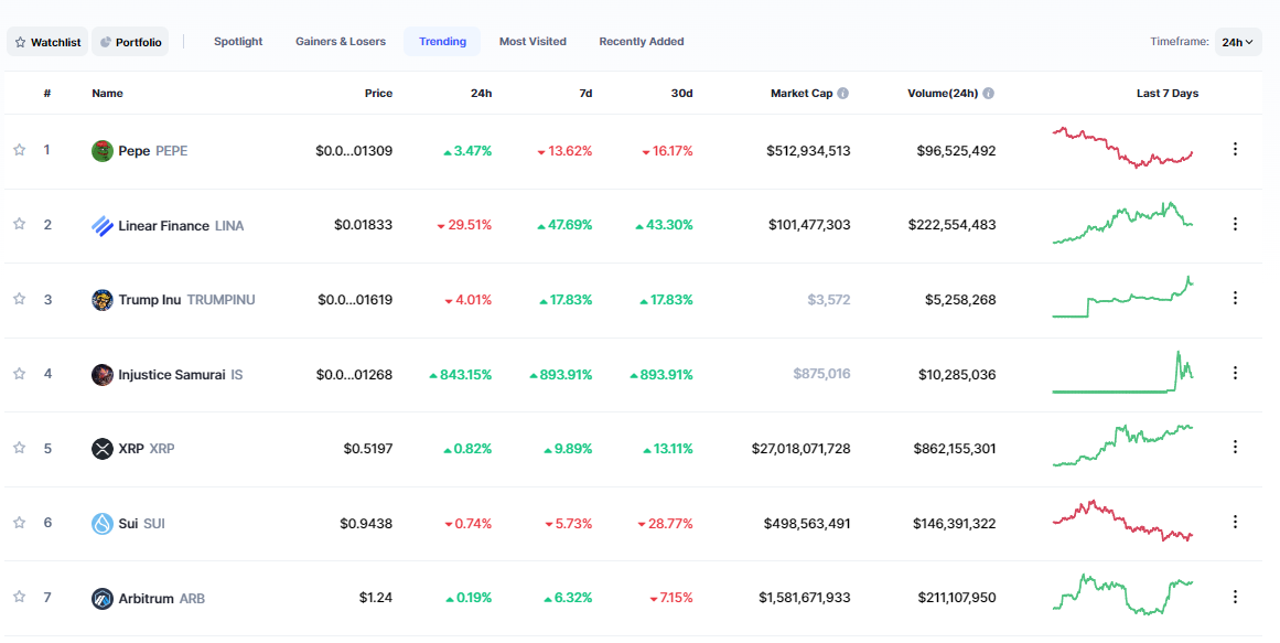 Yukarıdaki listede CMC’de trend olan varlıklar yer almakta. PEPE, XRP ve SUI isimli 3 altcoin’in 2 listede de ortak olması, bu 3 ürüne yoğun bir ilginin olduğunu kanıtlamakta.