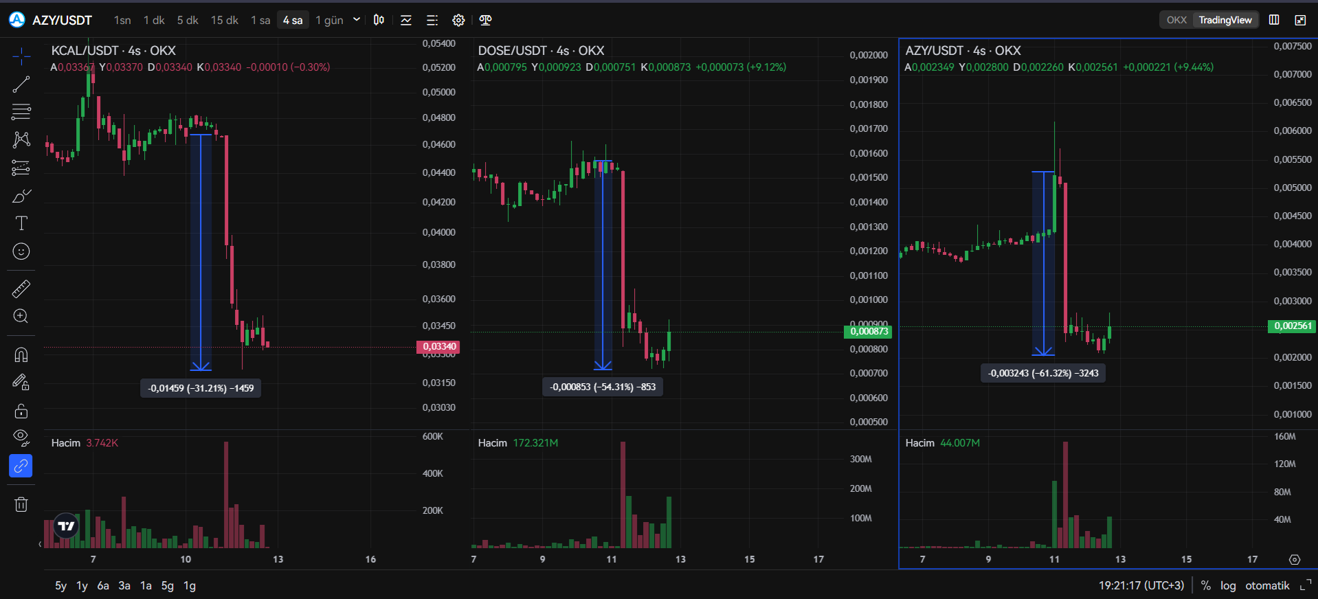 Bu delist kararı ile birlikte KCAL -%31, DOSE -%54, AZY ise -%61 oranında sert düşüşler yaşadı. Şuan itibariyle bu altcoin’ler halen toparlanmayı başaramadı.