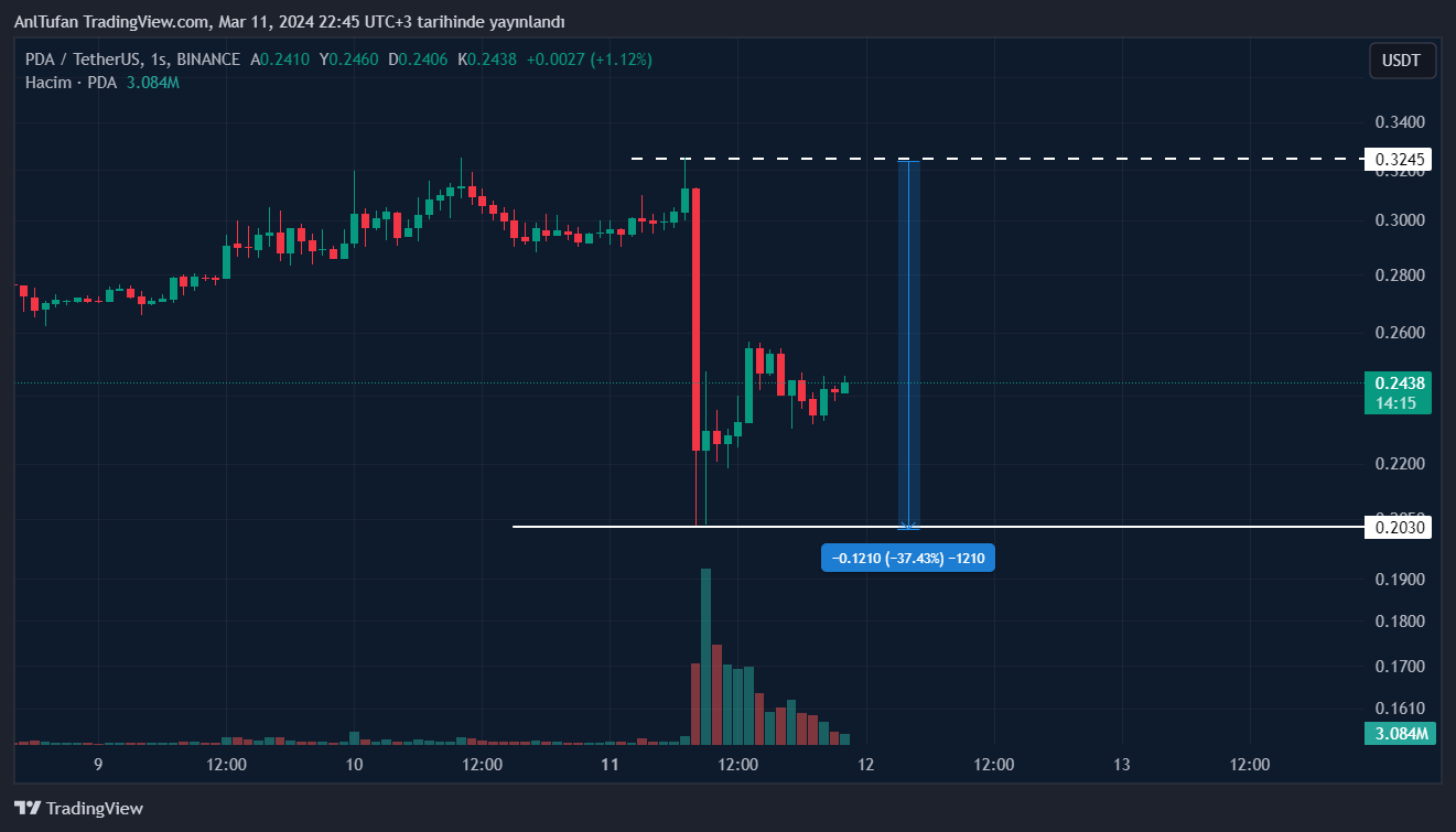 Delist duyurusu ile birlikte %30’dan fazla değer kaybeden PDA, tekrardan yavaş yavaş toparlanmaya çalışıyor. Her şeye rağmen PDA’nın Binance borsasından kaldırılmadığını unutmamak gerekiyor.